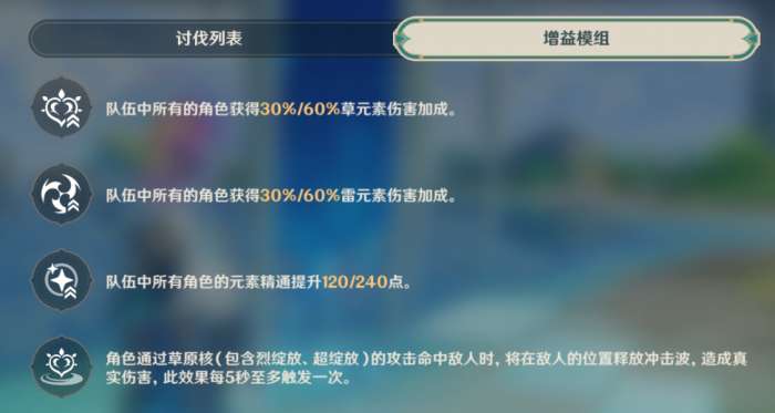 总的来说,今天的关卡较为考验对群能力,增益效果为对雷元素、草元素、以及绽放类反应等的增幅,较为推荐绽放类、激绽类、具有聚怪对群能力的队伍。