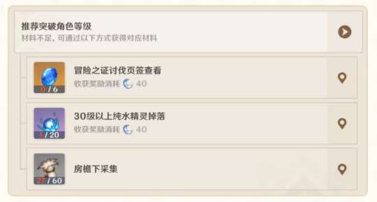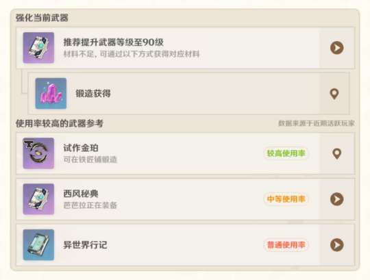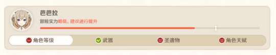提升建议具体分为以下几个部分:角色等级、武器、圣遗物和角色天赋。在角色列表中点开角色头像,会出现下图,提示玩家哪一部分需要提升。