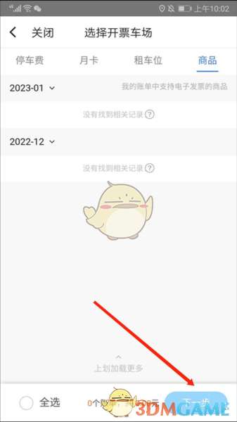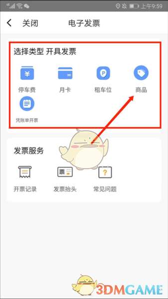 3、进入到电子发票界面,包括“停车费”、“月卡”“租车位”“商品”和“凭账单开票”类型,这里以“商品”为例,