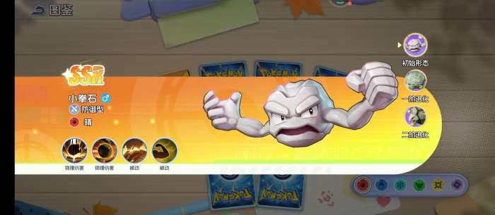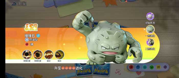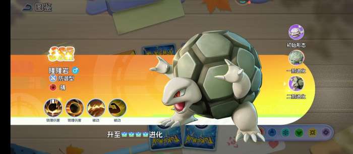 在升级之后就会成为隆隆石。在这一个阶段的他体型就会变得比较大,岩石的表面也有很多的疙瘩。在战斗的过程中还是会很有存在感的,技能伤害范围比较广,而且所造成的伤害也很出色,被动技能触发的频率相对比较高。就好像是一座崛起的山峰一样,总是会用身躯抵挡在队友的面前,在每一次承受攻击时,总是会拥有着更强大的反击能力。而在完成进一步的进阶之后,就会变成另外一种形态。