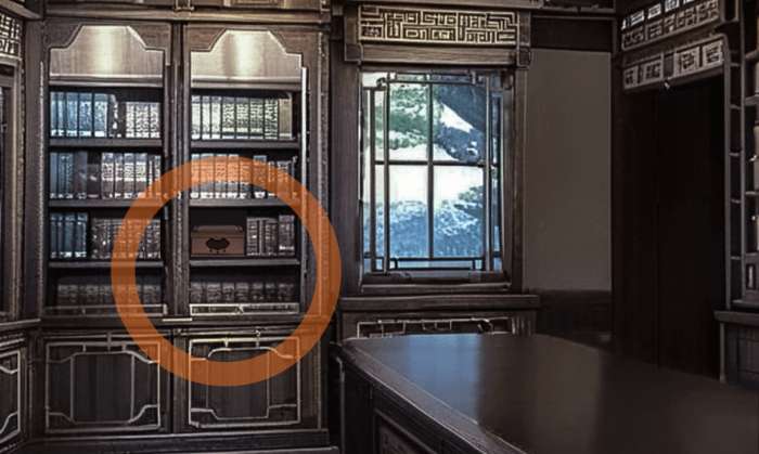 捡起地上的木偶,获取窗台上的木鸟,点击书柜下的天平图案,将砝码放上去。