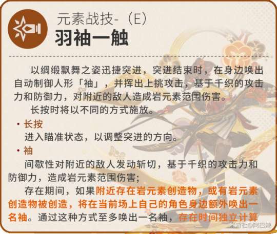 (1)首先,元素战技是千织的后台伤害主要来源,伤害最大化的原则就是保证两个人偶“袖”在场输出。(ps.根据上图双人偶的触发条件, 0命千织的队伍中需要能够提供岩造物的队友,1+命座千织需要岩系队友组双岩)(钟离、阿贝多、荒泷一斗、凝光、岩主可以创造岩造物,五郎E技能产生的旗子不算岩造物,故不能创造岩造物)