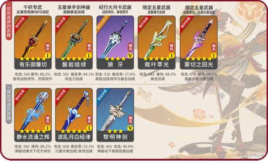 有的小伙伴可能会问,除了提到的武器,其他四星武器不推荐吗?答案是是的,经过阿巴辣分析,其他四星武器对于千织伤害的提升均劣势于满被动的精五三星武器“黎明神剑”,而作为脱手副C,千织实现90%以上血量的控制并不难,并且,黎明神剑获取方式极为容易,因此,以精五黎明神剑为分界线,之后的武器均不推荐。