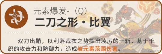 2命(落染五色)施放二刀之形·比翼即元素爆发后的10秒内,每3秒都将在当前场上自己的角色身边唤出一名简易自动制御人形「绢」。绢将对附近的敌人发起攻击,造成相当于袖170%的岩元素范围伤害,通过这种方式造成的伤害视为元素战技伤害。绢将在进行一次攻击或存在3秒后退场。