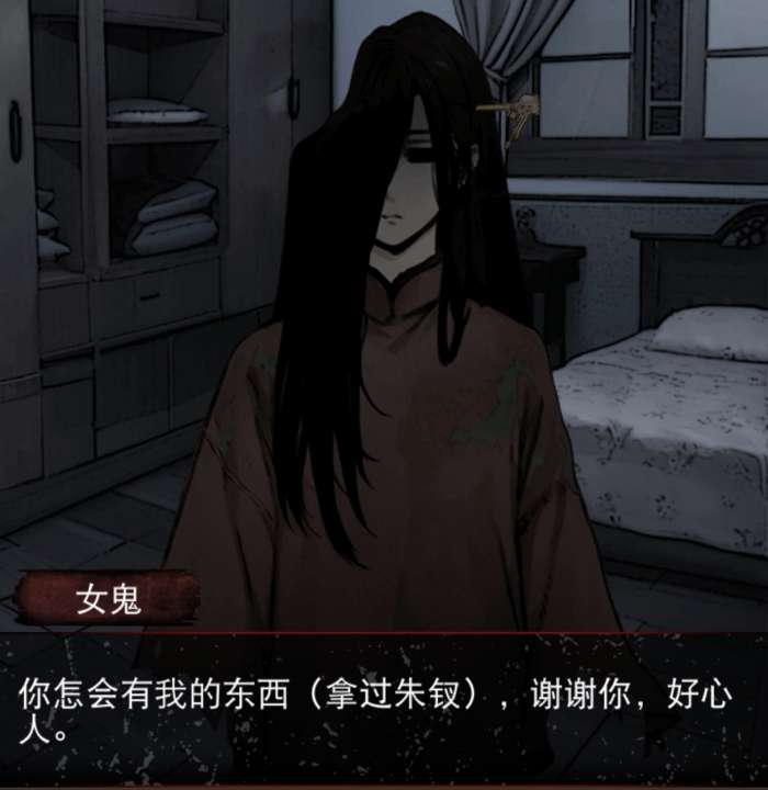 来到别雅园右边戏台下面新场景,左走用银色钥匙打开房间,开门小高能,需要猜中女鬼死亡原因(这里如果前面剧情里朱钗没有还给龙青青,直接给女鬼跳过回答问题),选被砸(因为女鬼头上有个大窟窿),获得蜡烛,拿起床上的手链(跟女鬼对话完,需要退出该场景再进入,会发现床上出现手链)