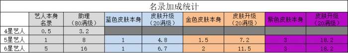 游戏内暂时没有皮肤名录统计筛选和皮肤升级增加名录数值说明功能,下面整理了助理提升、皮肤升级对名录的提升数值说明,不同版本可能有稍微区别,请已当前版本为准。