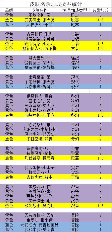 2、皮肤等级提升名录