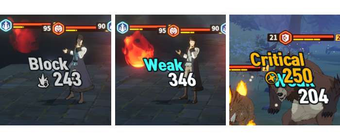 「有利属性造成的伤害」:根据攻击者与被攻击目标之间的属性相克机制,对造成伤害量进行增减处理。只有在使用「有利属性」攻击处于「不利属性」的敌人,造成克制伤害后,才显示蓝色的「WEAK」提示。