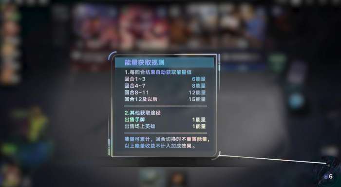 能量的获取规则就是和下图所描述的一样,随着回合数量不断增加,也就是说随着对战的时间不断的增加,但是要注意的就是对战的能量不会随着持有的数量增加,也就是不会有利息的产生,所以不玩特殊的手段每位玩家能获取的数量基本上是一样的,这也就对玩家的经济控制能力有所考验了。