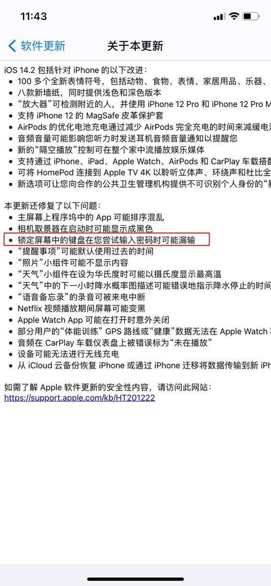 8、本更新还修复了以下问题:主屏幕上程序坞中的 App 可能排序混乱,相机取景器在启动时可能显示成黑色,锁定屏幕中的键盘在您尝试输入密码时可能漏输,“提醒事项”可能默认使用过去的时间