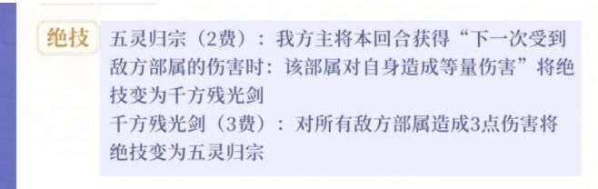 先说说紫英的技能,目前我个人感觉有点弱,看文字描述应该是先出五灵归宗再出千方bug剑,五灵归宗1费开始cd两回合,3费能出,然后4费开始cd3回合,7费才能出3费打3,黄花菜都凉了啊!如果先bug剑就好了