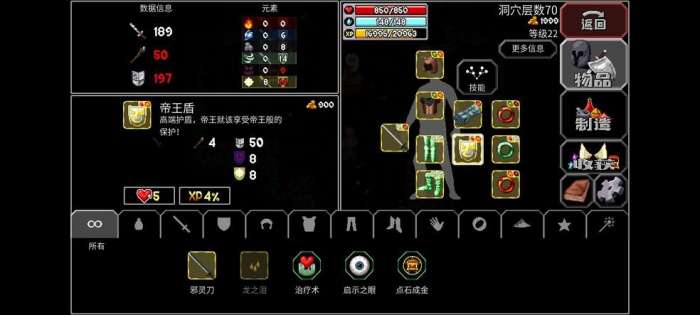 背包没有堆叠限制,最起码100不是上限,更多的我没试验过。除了本身就是金色的装备,药水、怪物战利品和白色装备必须点金成为神器才能带出洞穴。点金的唯一途径是技能树上面的“点石成金”技能,25魔法一次。