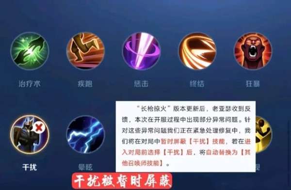 而官方的處理措施是先暫時屏蔽召喚師技能“干擾”,也就是說導致大規模BUG的“罪魁禍首”便是該技能,否則官方也不會將已進入遊戲玩家的“干擾”替換為其它技能。