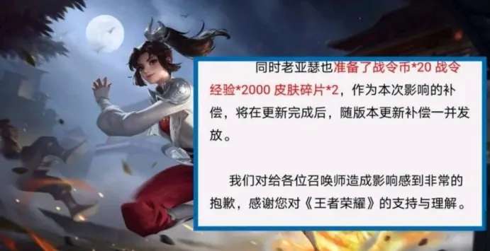 為了彌補開服時間的延長以及BUG帶來的影響,官方為全服玩家發放20戰令幣、2000戰令經驗和2個皮膚碎片的補償獎勵,該獎勵將會在版本更新後統一發放,大家可以在遊戲內的郵件領取。