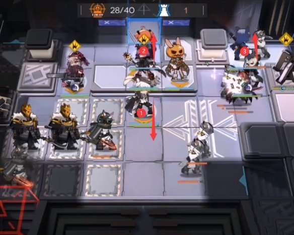 银灰再部署CD完后,如图所示部署(向下),然后部署重装(向上),先锋可以放在奶盾背后增加一下阻挡数。