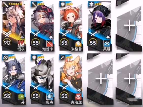 需求干员:泡普卡(群攻近卫)、芬(挡2先锋)、斑点(奶盾)、米格鲁(重装)、芙蓉(单奶)、克洛丝(单狙)