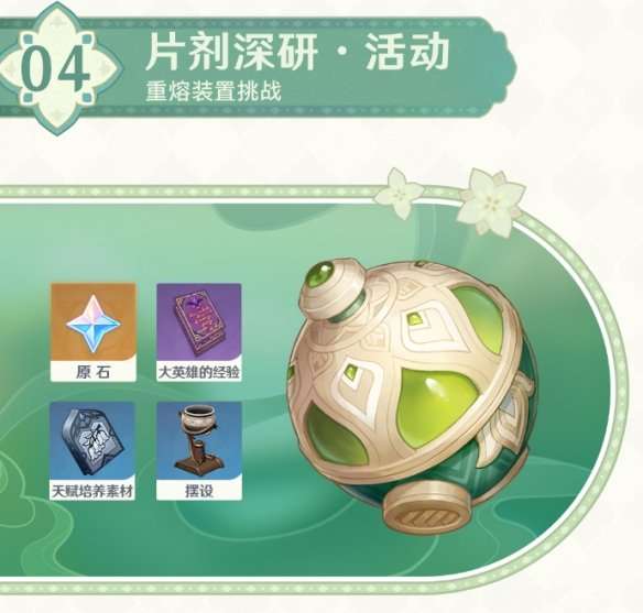 活动期间,协助须弥的哈贾娜德进行研究,借助「重熔效应」进行战斗,完成相应试验和任务即可获取摆设「清馨良药的悬釜」、原石、天赋培养素材等奖励。