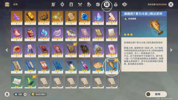 2、接着选择畅饮枫达,然后打开背包的任务栏,随后需使用满载的拳力斗技枫达奖杯;