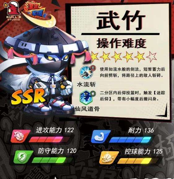 武竹在游戏里的表现会比较优秀,利用主动技能可以向敌人劈砍,一旦路径上有对手,那都可以直接用这项技能清除对方,对方如果已经拿到篮球的话,那还可以强制掉落,这项技能不只有一定的进攻能力,还会有防守能力,非常适合在对战的过程中通过灵活操作发挥角色的特性,除此之外,角色还会有一项被动技能,在投篮之后还会转身,这个动作能提升投篮的命中率,顺利投篮之后,玩家还可以会增强的体力。