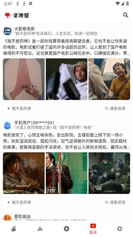 软件提交 专题合集 热门手游资源猫app怎么使用,在本站下载安装软件,打开进入首页,进入首页可以看到丰富的影视资源,可以点击搜索框,输入影视名称点击搜索即可,点击影评,可以查看大家的对影视的评价,让大家可以发现更多好看的影视。