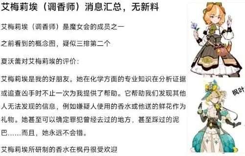最后就是4.8卡池新五星草系角色调香师的相关消息了,废话不多说,大家直接看下图哈,其中提到夏沃蕾对调香师的评价,调香师的真名叫作艾梅莉埃,她研制的香水在枫丹也特别的受欢迎,感兴趣的小伙伴们倒是可以期待一下后续的相关消息。