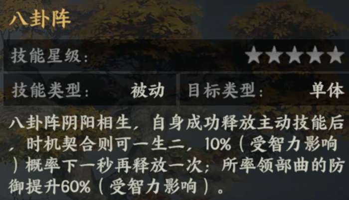 诸葛亮的技能组设计紧密围绕"智力差"这一核心机制展开,通过精准的技能释放可实现对敌方的致命打击。其主动技能"步罡踏斗"作为主要输出手段,能对敌方单体造成基于智力差的高额伤害。被动技能"卧龙出山"提供了出色的防御反制能力,在受到普攻时提升部队84%防御力,这一机制有效弥补了弓兵身板脆弱的缺点。另一被动技能在兵力高于70%时提升8.3%普攻伤害系数,增强了诸葛亮的持续输出能力。值得注意的是,兵力阈值效果在实战中需要配合治疗或护盾武将才能维持最佳状态。兵书技能"八卦阵"是诸葛亮质变的关键,释放主动技能后有10%概率立即再次施放,同时提升部队60%防御力。这一双重效果既提供了爆发潜力,又增强了生存能力。当触发连击时,诸葛亮可瞬间打出成吨伤害,甚至直接秒杀满血敌人。专武系统解锁后(30级),诸葛亮的输出能力将进一步提升,建议优先为其获取专属武器。