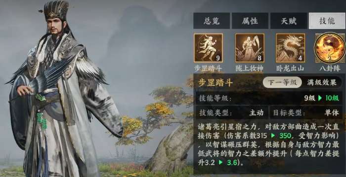 诸葛亮在《三国群英传:策定九州》中拥有全游戏最高的智力成长值,这使其成为弓兵阵容当之无愧的核心输出武将。从武将定位来看,诸葛亮属于高爆发单体输出型角色,特别擅长通过智力差机制对敌方关键单位进行快速斩杀。其主动技能"步罡踏斗"能根据自身与敌方智力最低武将的智力差值获得额外伤害加成,每点智力差提升3.6点伤害。这意味着当诸葛亮面对智力较低的武力型武将时,往往能打出很稳定的伤害效果。兵种适性方面,诸葛亮专属弓兵部队,在战斗中可充分利用射程优势进行远程打击。需要注意的是,游戏内存在兵种克制关系(骑兵克弓兵,弓兵克枪兵,枪兵克骑兵),因此在实际部署时需要避免被敌方骑兵近身。