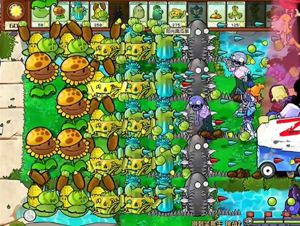 3、第四列种植一列的寒冰仙人掌之后,我们就开始在第六列种植钢刺坚果王,抵御冰车和巨人僵尸。
