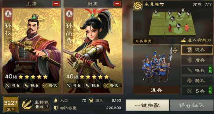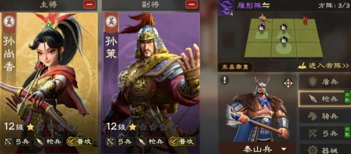两人一起上阵能激活江东帝胄,进一步提供普攻所打出的伤害,而且孙权能为队伍带来不错的暴击加成,对于走普攻流的孙尚香来说可谓非常的关键,再加上孙尚香也能为孙权提供穿透率加成,所以两名武将在相性方面可谓相当的合适,也是游戏内各大榜单上比较常见的吴国兄妹阵容。此外,若是各位担心这套阵容被反击队克制,可选车悬阵来进行应对。