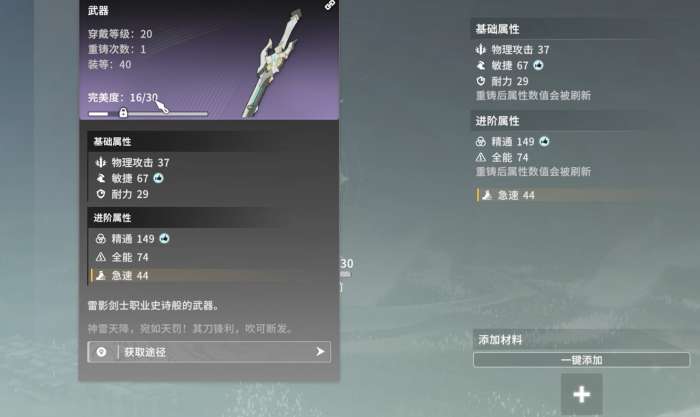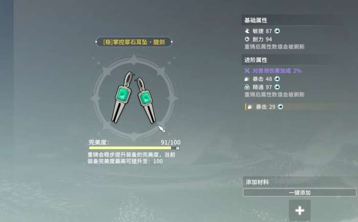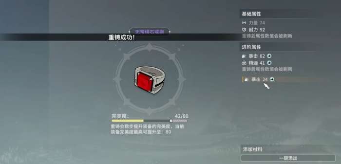 多出来的装备词条及其所带的属性数值为随机生成,无法指定,当各位将重制过一次的装备再次进行重铸时,重铸词条也会再次刷新,不一定会是原先的词条,有着很高的随机性。要注意的是,在装备的完美度到达其自身的峰值后,原本的装备属性和装备词条数值也会就此固定下来,不会再增加。所以,若是玩家们追求满值装备,那么最好将装备的完美度重铸到顶,缺资源时可点一下添加材料的格子,然后按提示去进行资源的获取即可。