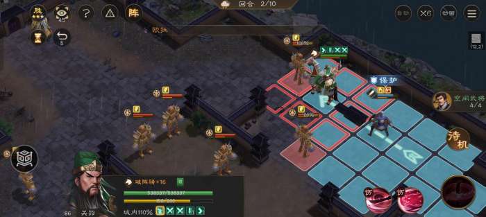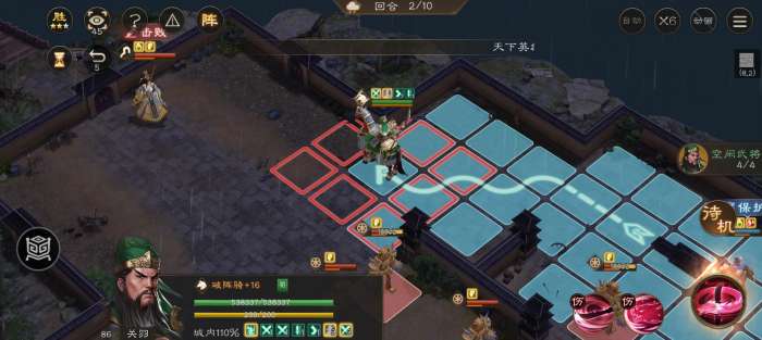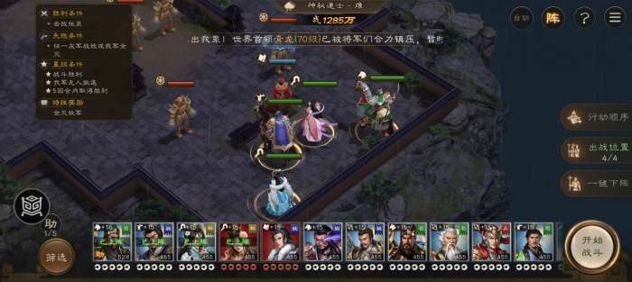 本关的核心是你要有一个强力关羽,如果你没有可以点助战问大佬好友借一个高战力的关羽!其他出战人物带曹操,貂蝉和蔡文姬!开局站位如图所示。