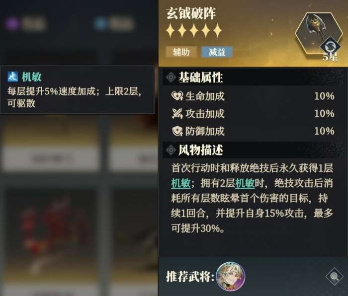 朱然的风物最优先选择推荐风物-玄钺破阵。它的三个特性:永久加速度、绝技眩晕、永久加攻击,都完美契合朱然的机制。朱然自身99速度较慢,开场获得1层【机敏】可将其速度提升至104,并且绝技施放频率很快,可以迅速叠满10%速度加成,提升出手频率。叠满2层【机敏】后,下次释放绝技时可消耗所有层数眩晕首个绝技目标1回合。朱然每回合都会施放2次以上绝技,加上开场送的1层,首回合即可打出眩晕控制。最后的最多30%攻击提升与风物-玉角鸣和一样,属于内置增益,不显示在状态栏且不可驱散。