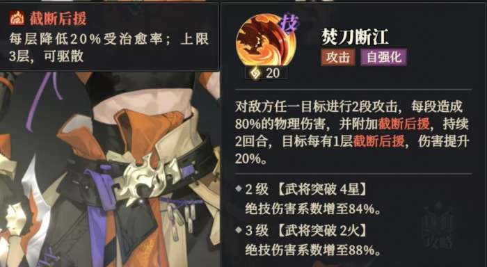 朱然推荐携带破军套朱然的绝技能同时为敌方附加【截断后援】【丧志】等多种减益和控制效果,如搭配甘宁、毒队还能附加【中毒】【免伤降低】【噬浪】【白疫】等多种减益,携带破军套能几率附加【流血】,增加减益数量,变相降低【中毒】【截断后援】等重要减益被驱散的几率。