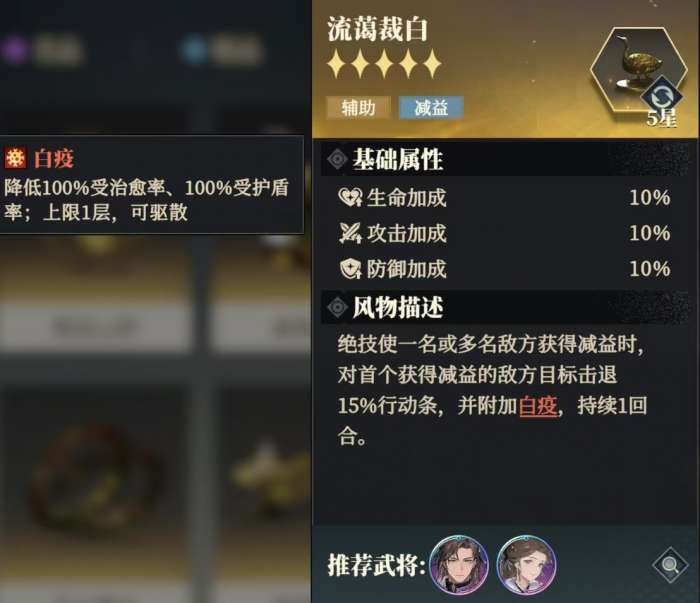 另一种选择是风物-流蔼裁白。流蔼裁白能在绝技附加减益时,额外推条15%并附加【白疫】,朱然的绝技本身能附加【截断后援】,符合该风物的使用条件,高频率施放绝技能多次触发推条效果,极大延缓敌方行动时序,并为目标附加【白疫】,与【截断后援】和【中毒】组成3禁疗,彻底封锁敌方治疗能力。相比玄钺破阵虽然少了眩晕的硬控,但是在功能性上有过之而无不及。