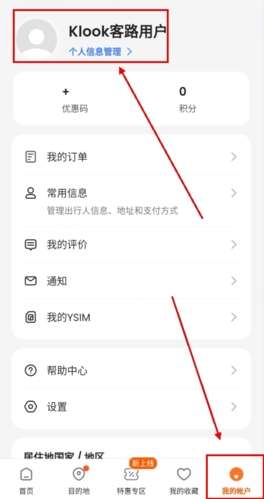 1、在klook客路软件我的账户界面,点击最上方【个人信息管理】;