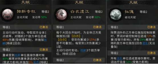 当敌方的火力成功转移之后,那么此时的贾诩就会趁机而动,直接对敌方的目标造成谋略伤害,其次还将身上的混乱状态技能体现出来,对于整场的压制力相对来说特别突出,简直就是稳定流畅,让其他敌人看不出任何的差异,或者一丝一毫的缺点。吕蒙身上也有独特的天赋,那就是白衣渡江,在每次战斗开始之后都会对队友造成较大的护盾可以吸收大量的伤害值,甚至只要发挥出自己的主动技能之后,就可以一次性挑衅很多的敌人,让对方措手不及。
