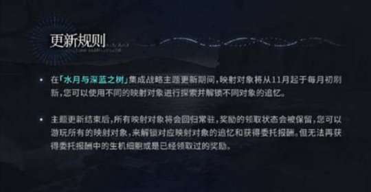 在「水月与深蓝之树」集成战略主题更新期间,映射对象将于每月初刷新,您可以使用不同的映射对象进行探索,并解锁不同对象的追忆。