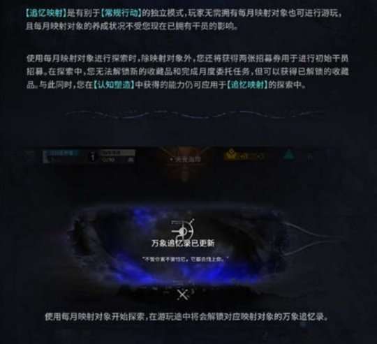 追忆映射是明日方舟游戏中的一种独立模式,与常规行动有所不同。即使您没有拥有每月的映射对象,也可以参与游玩,而且每月映射对象的养成状态不会受到您现有干员的影响。另外,水月肉鸽是追忆映射中的新模式。