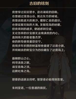 来到佩特莉可镇接取任务后就会有npc将我们指引到钟楼位置,当你闲得无聊爬上钟楼就会发现钟上有一道古老的铭刻……内容是一位名叫朱利亚诺的镇民留下来四处宝藏,并在铭刻中点明了位置。