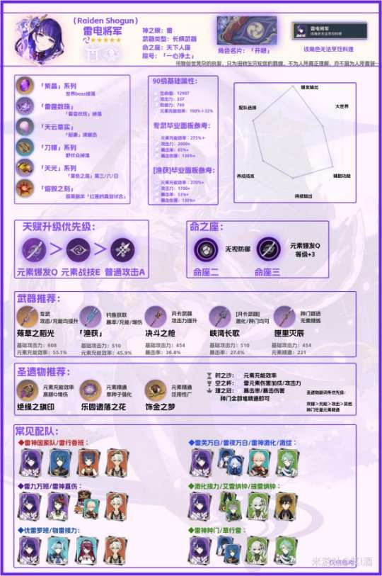 ·更建议二命雷电将军与六命九条裟罗选择此队伍,不过都是零命也不是不能玩。因为雷神在二命之前,作为主C的话有些勉强,甚至有的情况队伍的整体DPS(秒伤)还没有雷国高。而雷神因为二命其输出能力极大的提高,三拐一使其拥有很高的爆发伤害。