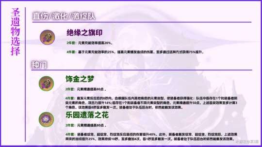 ·武器上充能类型的武器表现较为亮眼,其他常规武器也是不错的选择。直伤圣遗物依旧以绝缘之旗印为毕业选择,草反应配队中可以选择其他圣遗物。