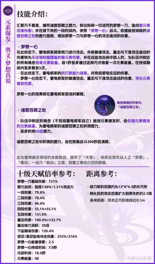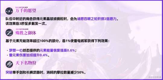 ·按额外充能效率的百分比提供额外的雷元素伤害加成,和「梦想一心」状态下的元素能量回复量的量。按270%的充能效率来算,可以提供68%的雷元素伤害和额外102%的回复量。