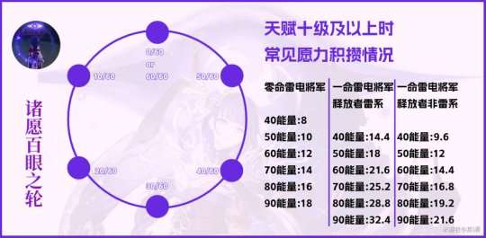 ①在除雷电将军外的角色释放元素爆发(Q)时,会为「诸愿百眼之轮」积攒愿力,其积攒量根据当前释放元素爆发(Q)的角色的元素能量决定。同上,例如班尼特释放元素爆发,那么就会按照班尼特元素爆发所需的能量来决定积攒的愿力。积攒速度将在天赋等级十级时达到最大。(一命下积攒会有会有不同,若释放者为雷元素则有额外愿力恢复,非雷系也有提升)
