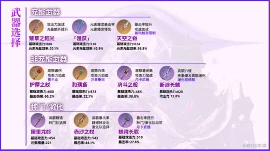 ▼武器毕业以薙草之稻光和「渔获」为主,充能效率在270%以上为优,如果是专武的话可以要求低一些;如果不是充能武器的话,建议将面板的充能效率提升至270%往上最好;种门和激化队伍的成本低,养成较快。
