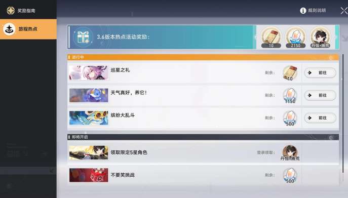 总结3.6版本福利很多啊,送新5星角色丹恒·腾荒,还有大量新活动和新玩法。