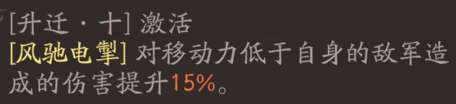 最大的质变来源于升迁5获得了在任何地形都不会增加移动力消耗的特性,这使她在任何地形都可以发挥出无与伦比的机动性(飞将的女儿会飞这很合理)。升迁10则是简单粗暴额外给了15%增伤,考虑pve中敌军的骑兵比例不是很大,还是相对容易触发的,注意如果执意选择弓骑路线,会变为仅对4移动力的步兵生效。推荐达到升迁7拿到<流星赶月>3阶。
