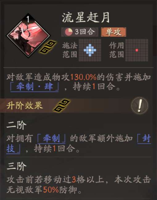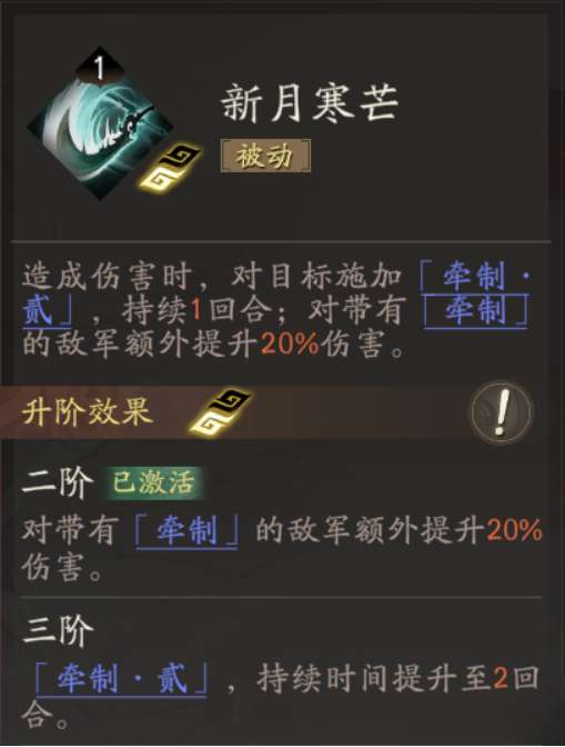 2阶增伤必须对出手前,已经处于<牵制>状态下的目标才能生效,自己只能搭配<弧光掠影>和3阶<新月寒芒>,又或者臧霸的天赋,如果决定使用这个技能的话,可以说是绑定臧霸副将,一切要记得切换。
