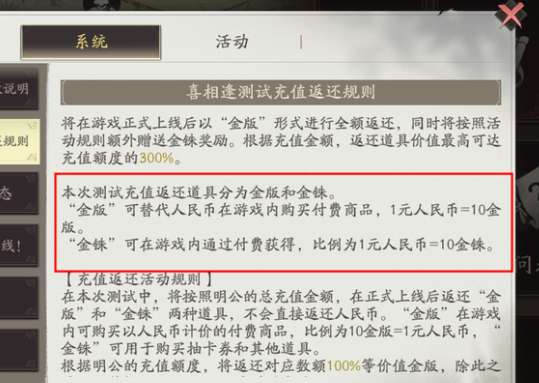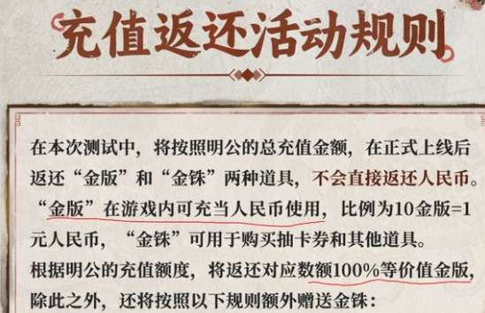 首先你需要明确这一次充值返的并不是人民币,而是两种道具。金铢就是其中的一种,到底是如何来计算的呢?那就是一块钱等于10个金版,一块钱等于10个金铢。金版用处还是比较大的,在进入到正式服之后就可以直接当做人民币,例如可以购买月卡,可以购买礼包,只要是标着人民币价格的商品全部都可以用来去兑换,相当于全额返还你的充值本金。金铢主要的作用那就是用来购买抽卡券,又或者是游戏中的道具,是为了帮助你囤抽卡资源。