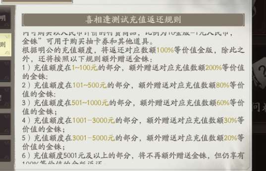 核心的返还规则是无论你充多少钱,第1次充值就可以拿到100%的金版,例如充100元就可以获得1000元,充198元就可以返还1980,这是固定的,主要的关键就是额外赠送的金铢,这一部分就是根据充值的分档来算,不同的档位比例会有所区别。例如当你在充值一元到100元的时候,就会额外的赠送200%的金铢,而如果是充值101元到500元,那返还的就是80%。如果是501元到1000元,那就是返还60%,可如果是超过5001元就不会额外的赠送。
