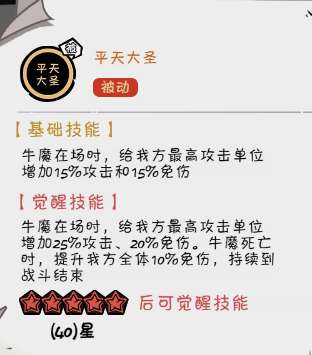 牛魔的一技能为队伍提供了控制的能力,普通是瞄准敌方攻击最高的单位,降低其攻击和免伤效果,同时牛魔被动在场是提升我方攻击最高单位25%攻击和20%减伤。